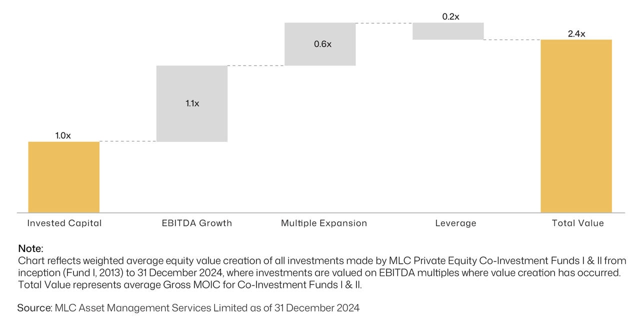 While it's often assumed that PE returns stem mainly from multiple expansion or leverage, our PE co-investment program demonstrates that operational enhancements, evidenced by Earnings Before Interest Tax Depreciation and Amortisation (EBITDA) growth, have been the main driver of value (Chart 5).
