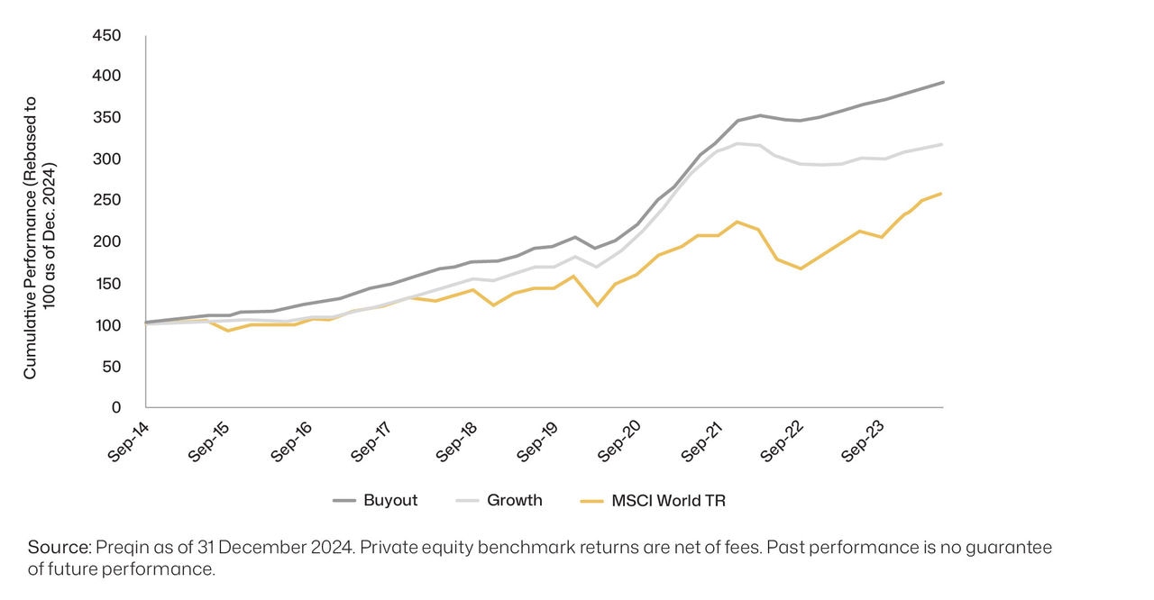 The Preqin Buyout index generated 20-year annualised returns of 14.8% (as of Q3 2024) versus the MSCI World 20-year annualised return of 9.2% (Chart 6).