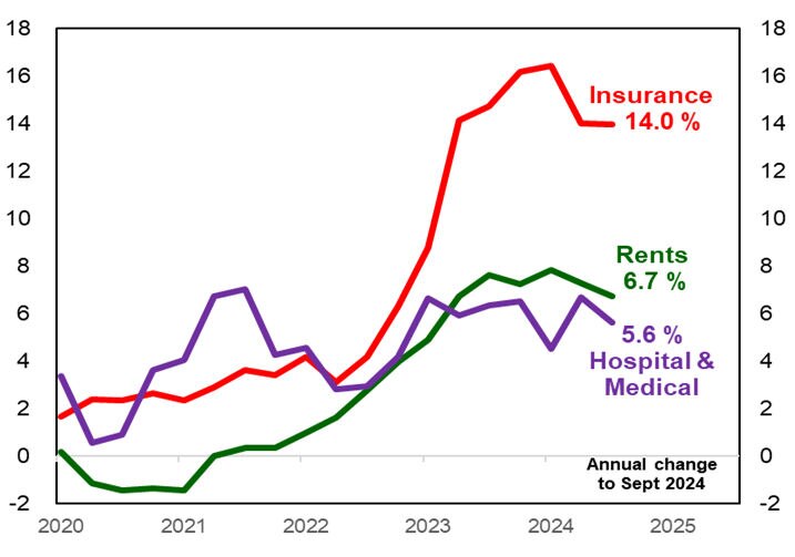 There are more persistent price pressures in health care, insurance and rents that remain troubling for consumers. In the year to September 2024, hospital and medical costs have risen by 5.6%, rents by 6.7% and insurance by 14%. (Chart 2). These services prices have been consistently rising over the past three years. Indeed, these price pressures are resistant to both consumer angst and the ‘painful squeeze’ on weekly budgets. The key problem for consumers is that medical, rents and insurance are effectively ‘essentials’ in which the consumer has little choice but to pay the price. For the RBA, the problem is that these ‘essentials’ are not responsive to higher interest rates reducing demand and thereby prices. The persistent inflation results in these “essentials” reflects a mix of specific challenges. These challenges include that Australia’s ageing population have more complex and costly medical needs, a lack of new housing construction over the past decade to meet a growing population and for insurance, a profound lack of competition and transparency.