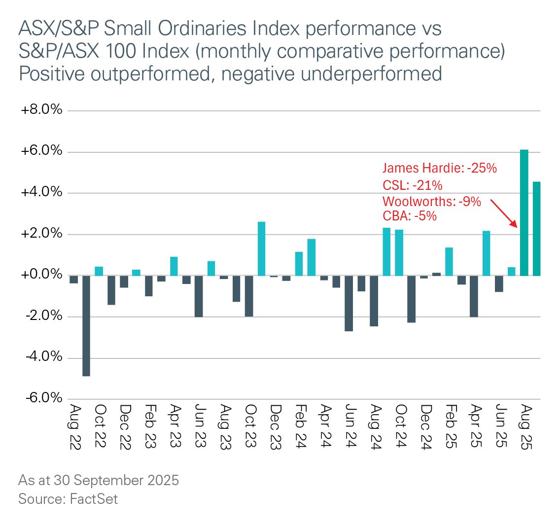The most recent August-ending reporting season validated many of the points above with the Small Ordinaries Index having its best month relative to large caps (ASX 100 Index) in over three years, outperforming by around 6%. This was followed up by a 5% outperformance in September (Chart 1).