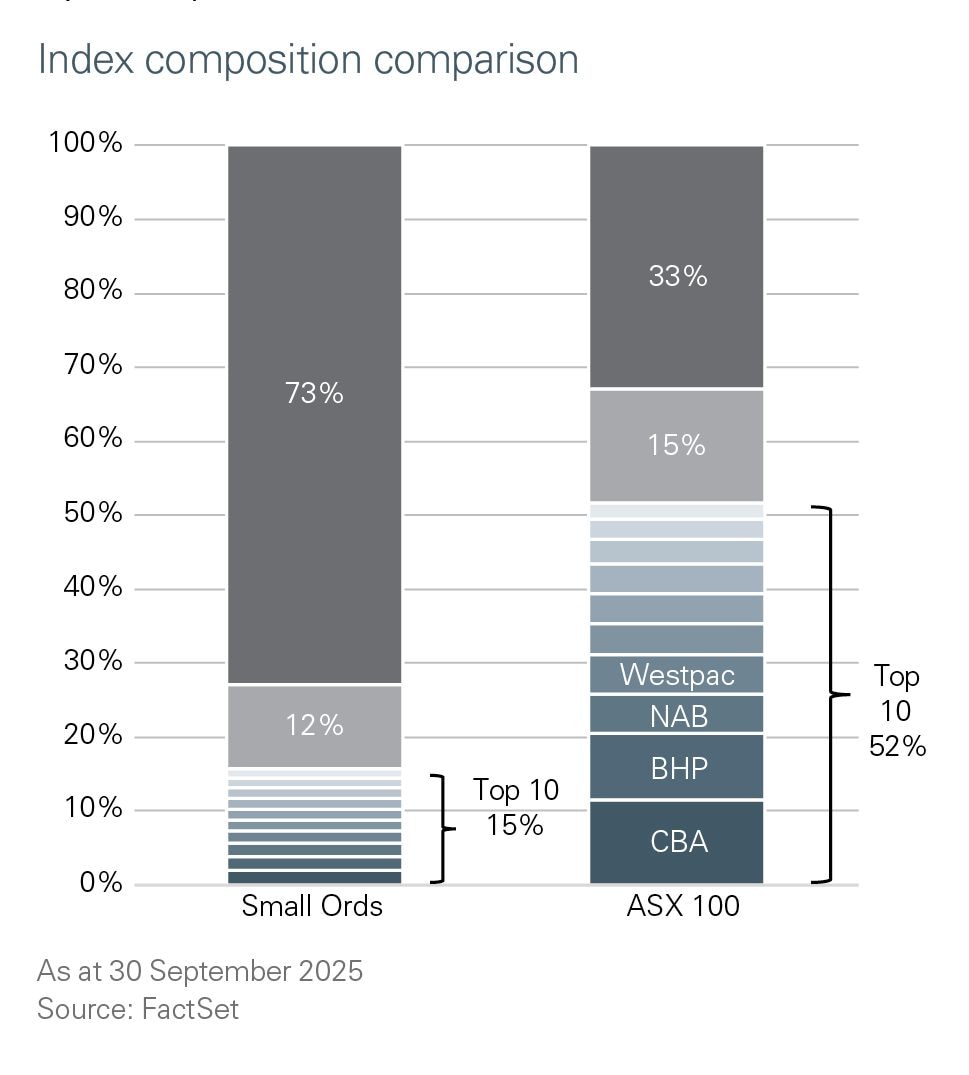 In our view, the Small Ordinaries Index’s greater diversification means that active managers don’t end up having to waste valuable portfolio space on stocks on which they have a negative fundamental view simply for risk mitigation reasons, as is the case when performance is benchmarked against large cap dominated indices like the S&P/ASX 200 Index (ASX 200 Index).
