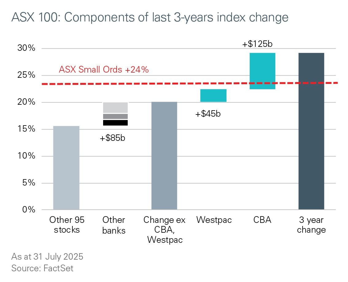 For the 3 years up to the end of July 2025 (the last month before what we hope is the start of a much more prolonged reversion), headline index returns show that large caps outperformed smalls by 5.6%.4 Over this period, CBA accounted for about 7% of the ASX 100 Index’s 29% return (Chart 4). If CBA had delivered a flat return, the Small Ordinaries Index would have outperformed the ASX 100 Index.