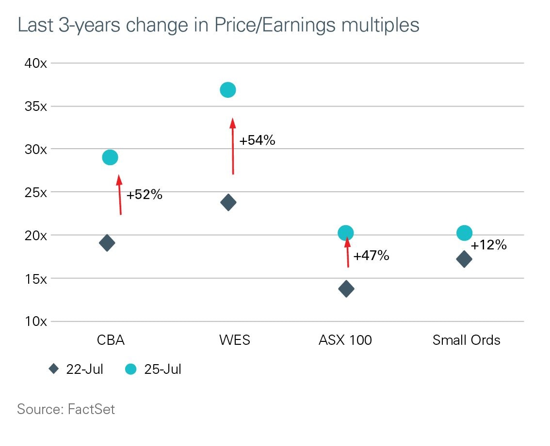 Chart 5: CBA, Wesfarmers, and the ASX 100 have benefited from significant valuation expansion
