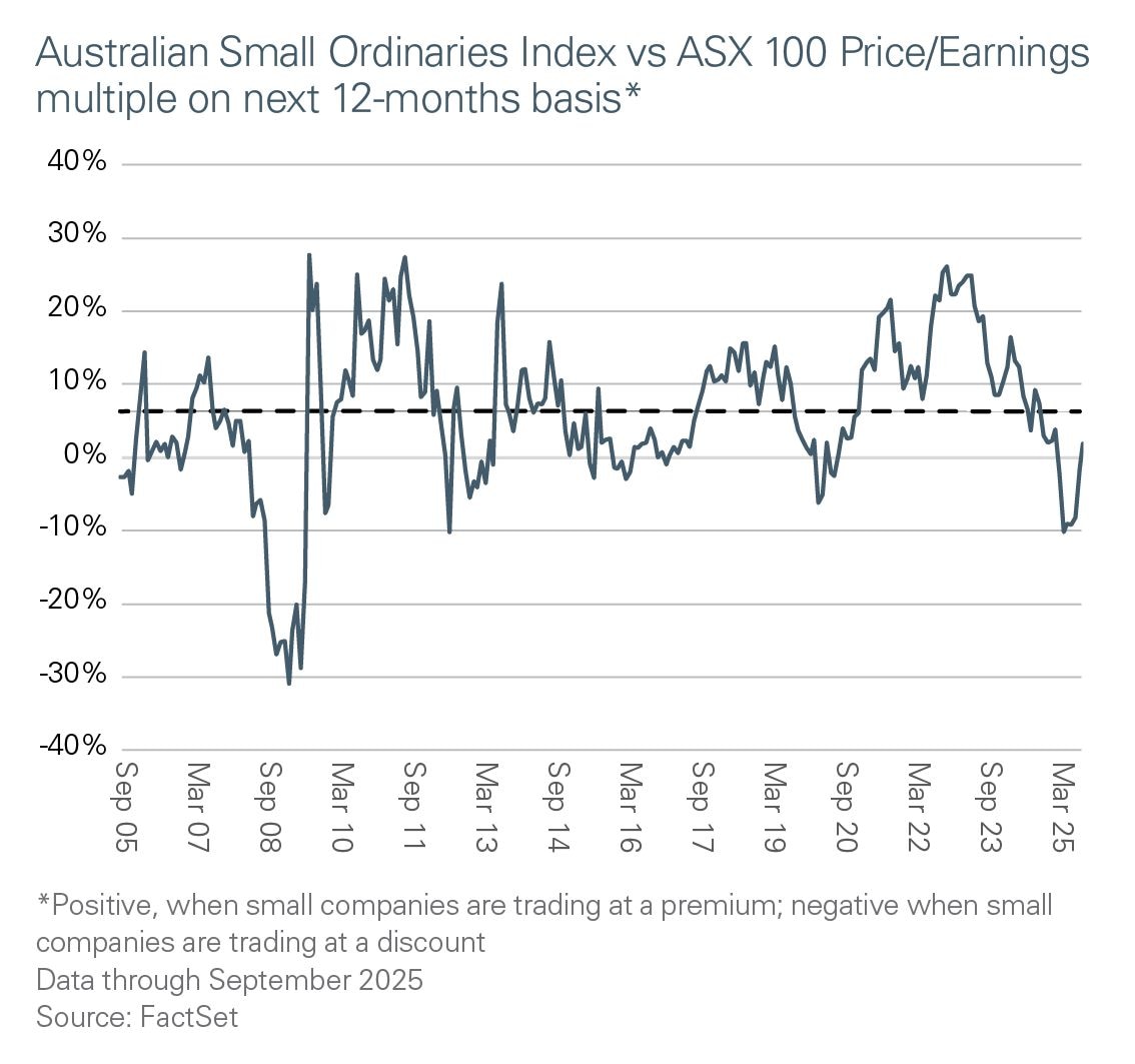 As we see it, the starting point for small caps’ performance, on both an absolute and relative basis, currently appears sound and the anticipated tailwind of further official cash rate cuts (both in Australia and the US) is still to come. Historically, small caps have outperformed in a rate cutting cycle.